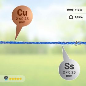 Vysokokvalitný vodivý drôt s UV ochranou na použitie v elektrických oploteniach. Nízky odpor len 0,17 Ω/m. Môže sa použiť aj na dlhé ploty. Modrá signálna farba, ľahko viditeľná pre lesnú zver. Nerezová oceľ 2 × 0,25 mm a meď 2 × 0,25 mm. Dĺžka 1000 m.
