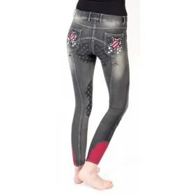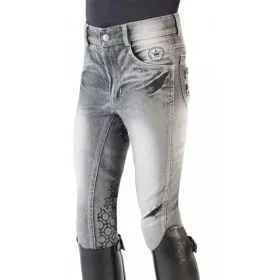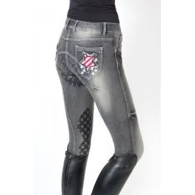 Mimoriadne módne riflové jazdecké nohavice v obnosenom vzhľade s protišmykovou vložkou v oblasti sedenia a na kolenách, s pútkami na opasok, prednými vreckami a elastickými členkami. Vyšívaná aplikácia s hviezdami na zadných vreckách dáva týmto nohaviciam ešte módnejší vzhľad; možné prať do 30 ° C.