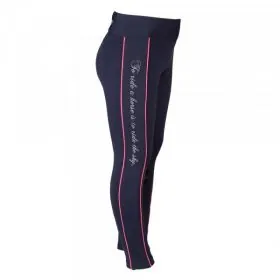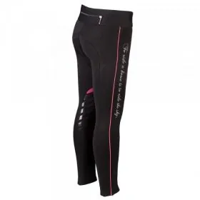 Veľkorysé vrecko na zips v zadnej časti poskytuje dostatok priestoru pre váš mobilný telefón, kľúče a podobne. Tieto legíny sú vylepšené farebne kontrastnými detailmi, ako sú časti ozdoby alebo farebné lemovanie pozdĺž celej nohy, a potlačou „jazdiť na koni znamená jazdiť na oblohe“. Naše jazdecké legíny sú tiež ideálne na nosenie ako overtrous na jazdeckých turnajoch. Ich vysoká elasticita umožňuje ľahké pretiahnutie cez biele jazdecké nohavice a chráni ich pred nečistotami; možno prať na 30 ° C (prať naruby).